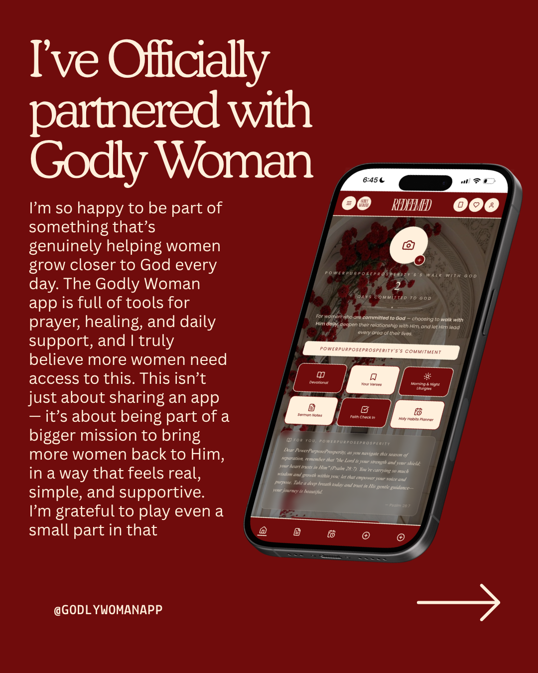 The Godly Woman App is a supportive space for women who want to deepen their relationship with God through daily devotionals, Bible study plans, and faith-filled community.